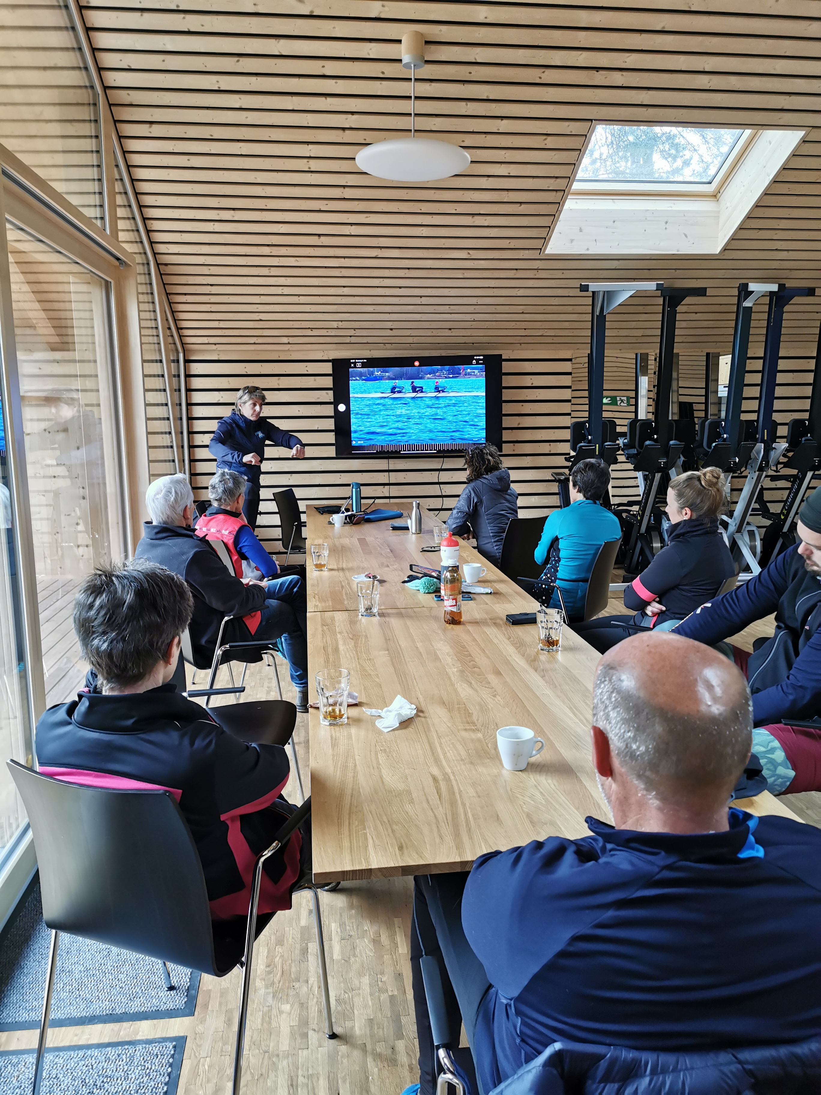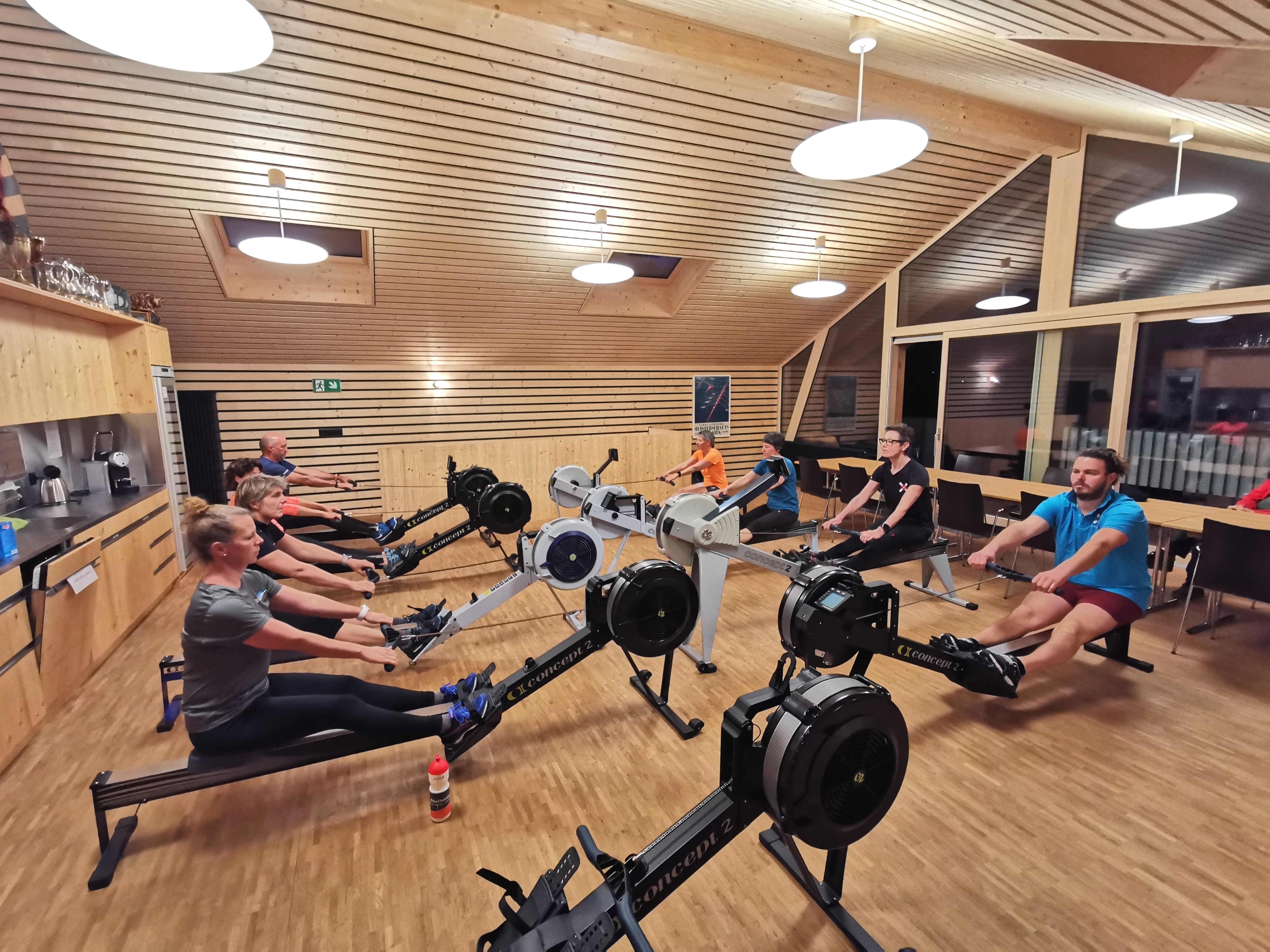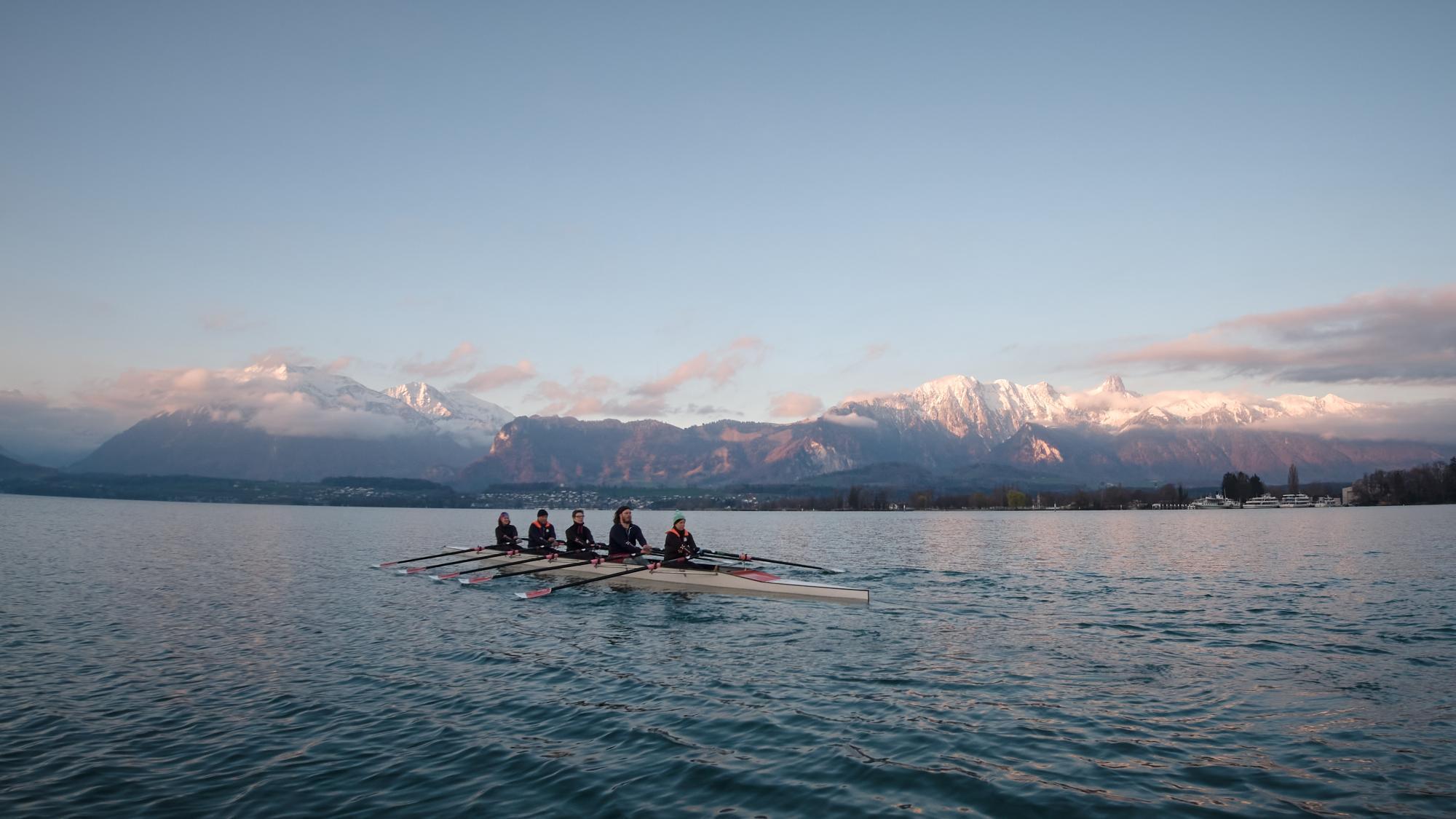 Das Warm-up starten wir um 06:00 im Seeclub Thun auf dem Ergometer, bevor wir die Boote satteln und die Aare aufwärts in den See rudern.