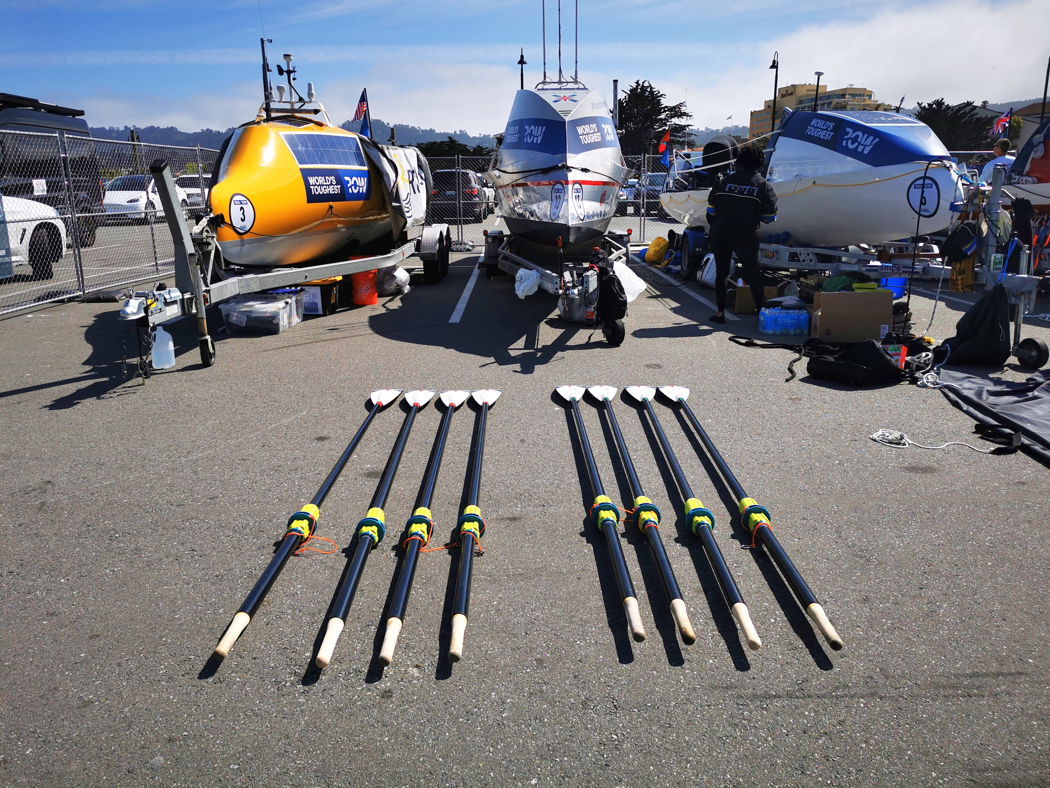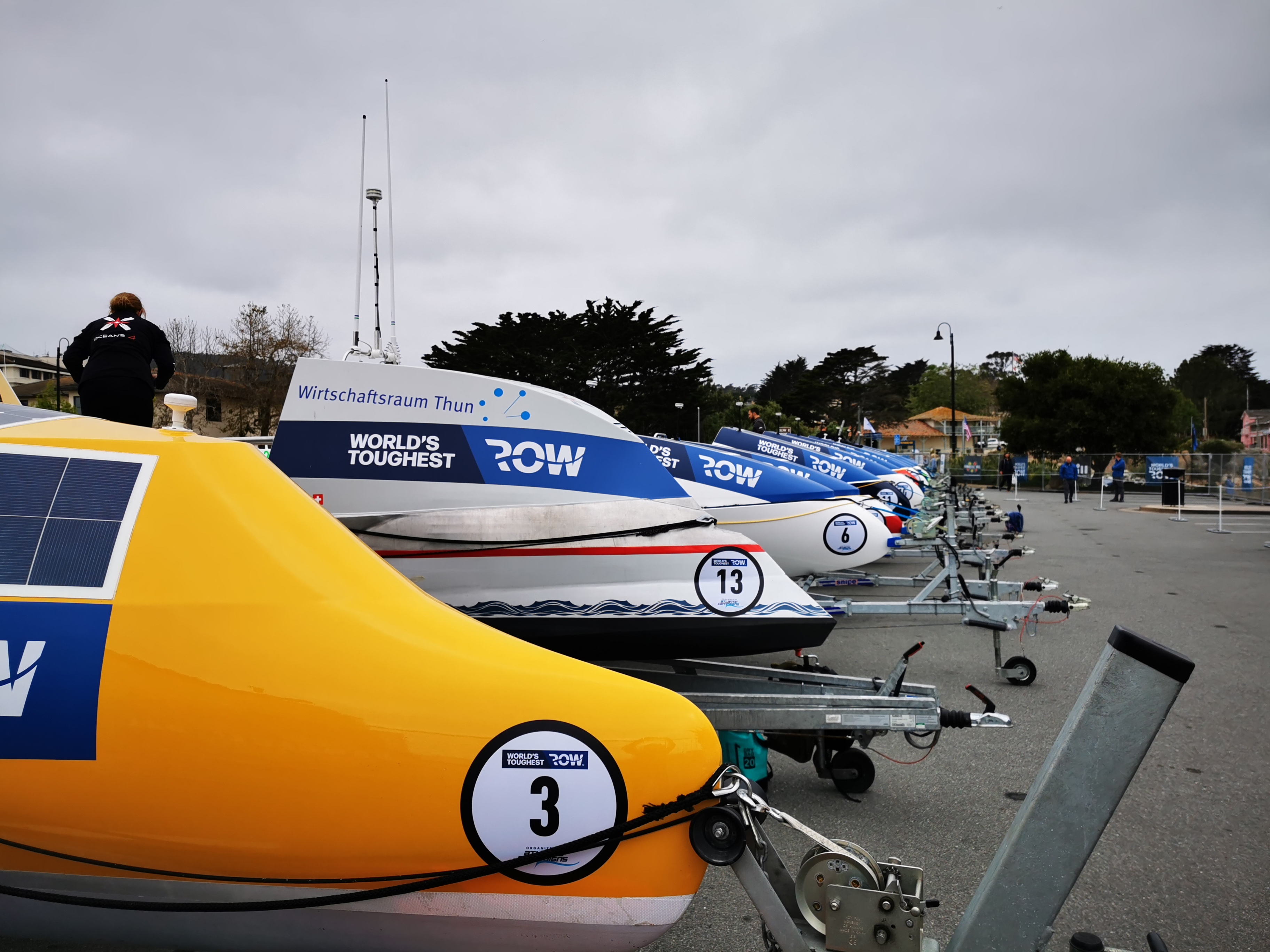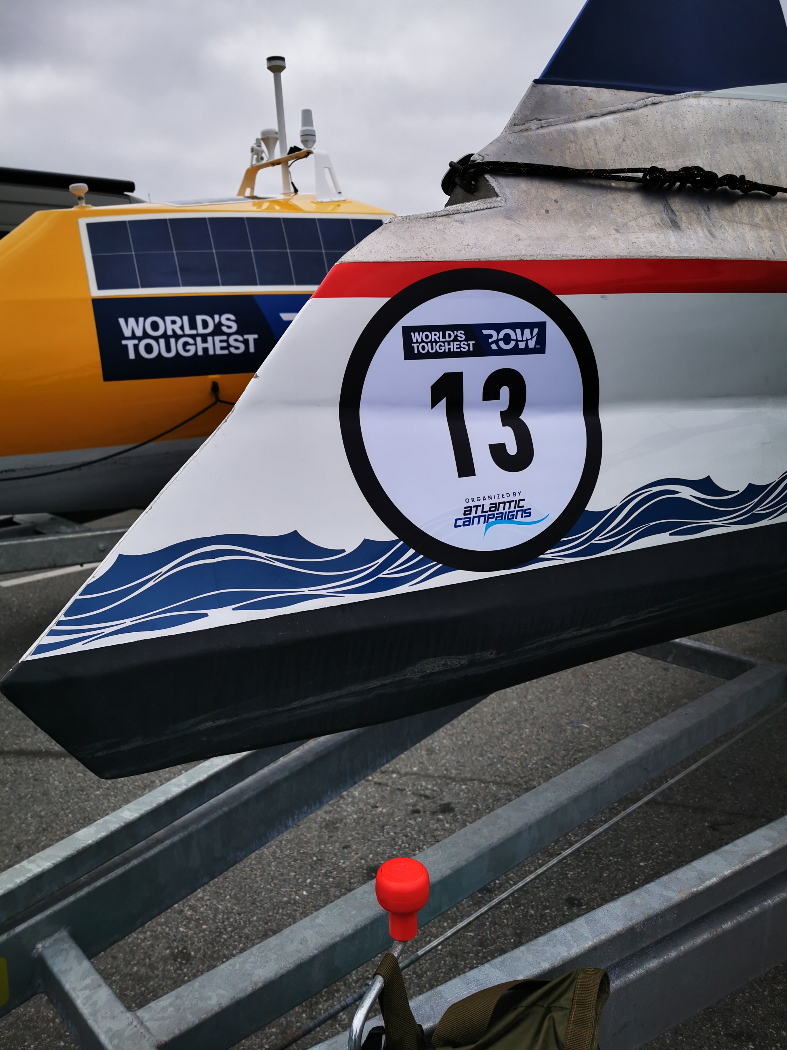 Direkt neben unserem steht ein älterer Bau aus den USA, ein gelbes Spindrift. Was dieses Jahr durch die Ereignisse im Atlantikrennen viel zu reden gab. Ein Boot des Typs kenterte bei schwerer See und hat sich nicht wieder aufgerichtet. Die vier amerikanischen Ruderer blieben unverletzt und wurden von einem Frachtschiff aufgenommen.
