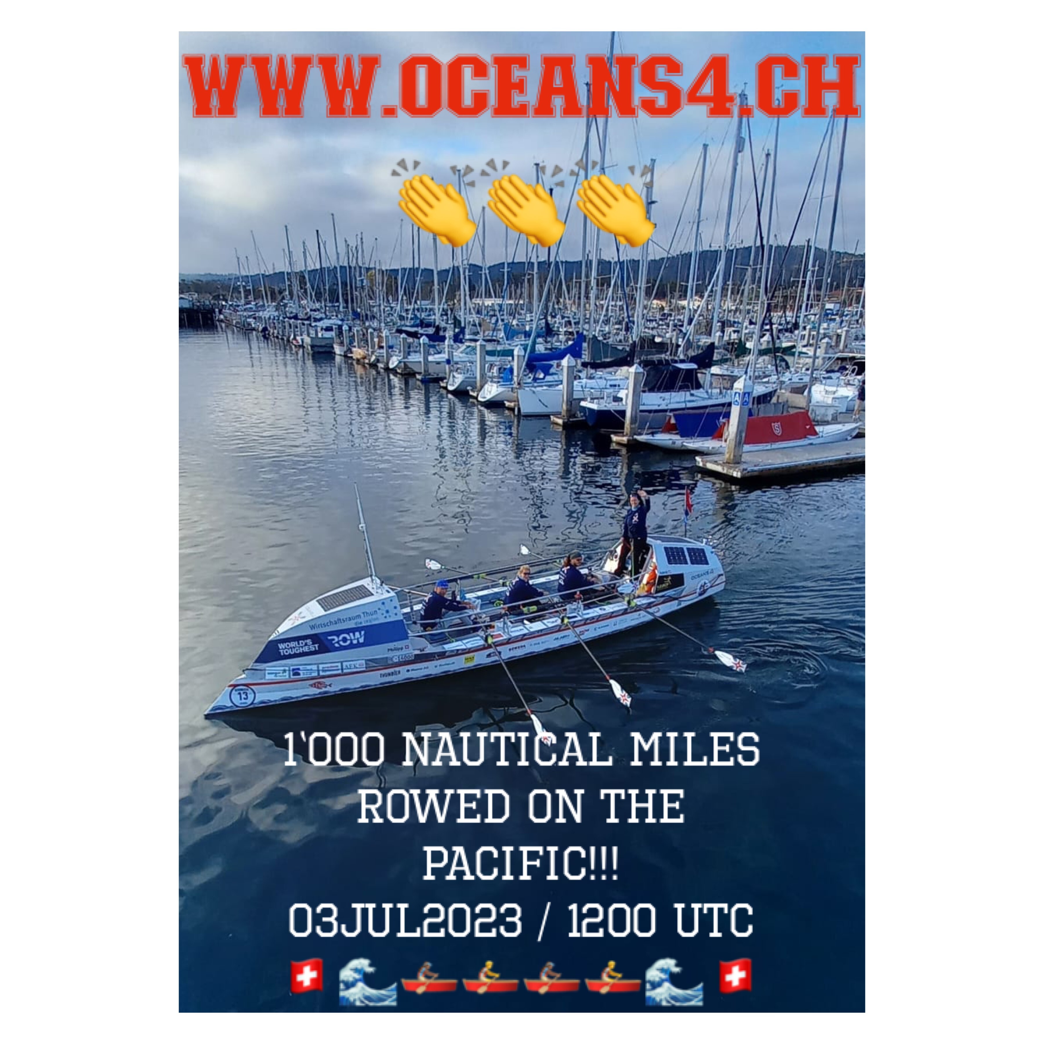 Die OCEAN'S 4 haben die magische Marke von 1'000 geruderten Seemeilen am 03.07.2023, 12:00 Uhr UTC erreicht. Dies entspricht einer Distanz von umgerechnet 1'852 Kilometern. Das Team bemüht sich weiterhin, den Kurs nach Westen zu halten, was bei Tageslicht einfacher möglich ist als in der Nacht. Astrid, Denise, Toni und Philipp sind wohlauf und pushen weiterhin Richtung KAUAI. Stay tuned.