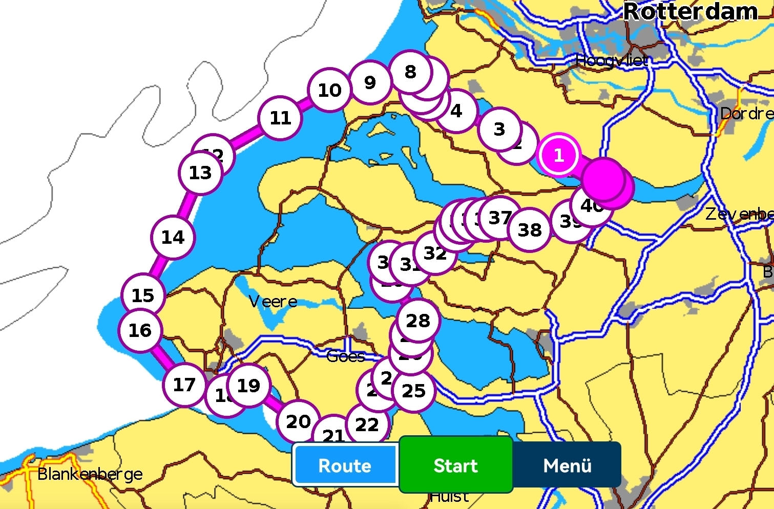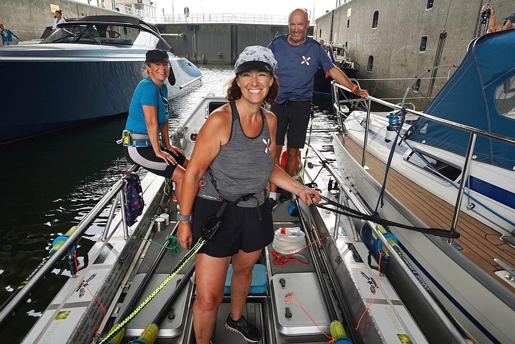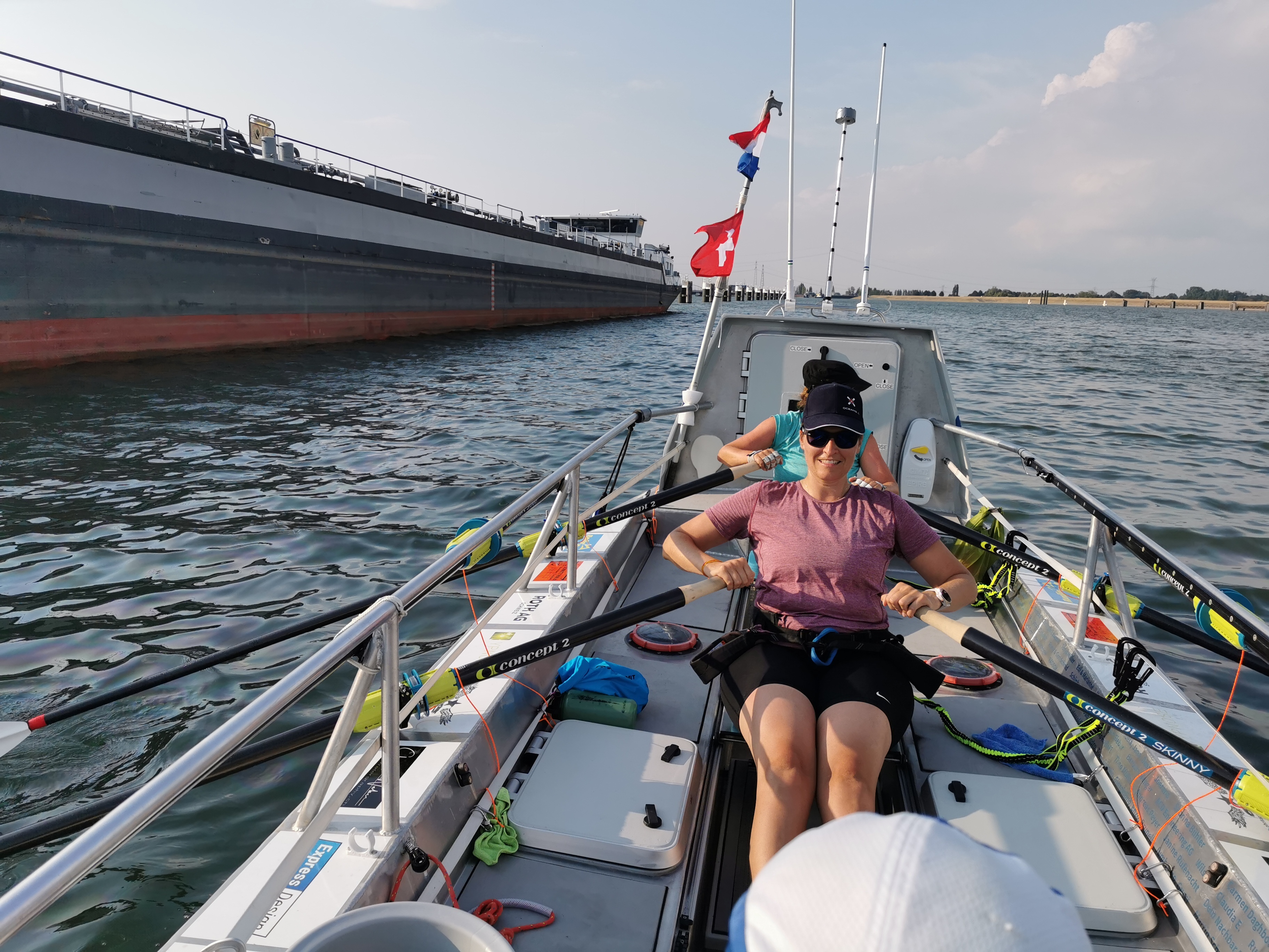 Samstag, 20:15: Ein letzter Check der Instrumente, der Funk läuft, die Geschwindigkeit wird am Display auf Deck angezeigt, der Autopilot hat mit kratzendem Geräusch seine Arbeit in der Heckkabine aufgenommen und es kann losgehen! Die vier nicken sich zu: «wir sind bereit»! Denise und Maria-Theresia legen sich in die Riemen und setzen das Boot, die Little SWISS LADY samt Philipp und Astrid mit rhythmischen Ruderschlägen in Bewegung. Hinter ihnen verschwindet langsam der holländische Heimathafen Numansdorp und das Team wird mit einem zauberhaften Sonnenuntergang beschenkt. Sie nehmen Kurs Nordwest zu ihrer ersten Aufgabe, die Stellendam-Schleuse in rund 40 Km Entfernung, die sie noch vor Sonnenaufgang passiert haben wollen.