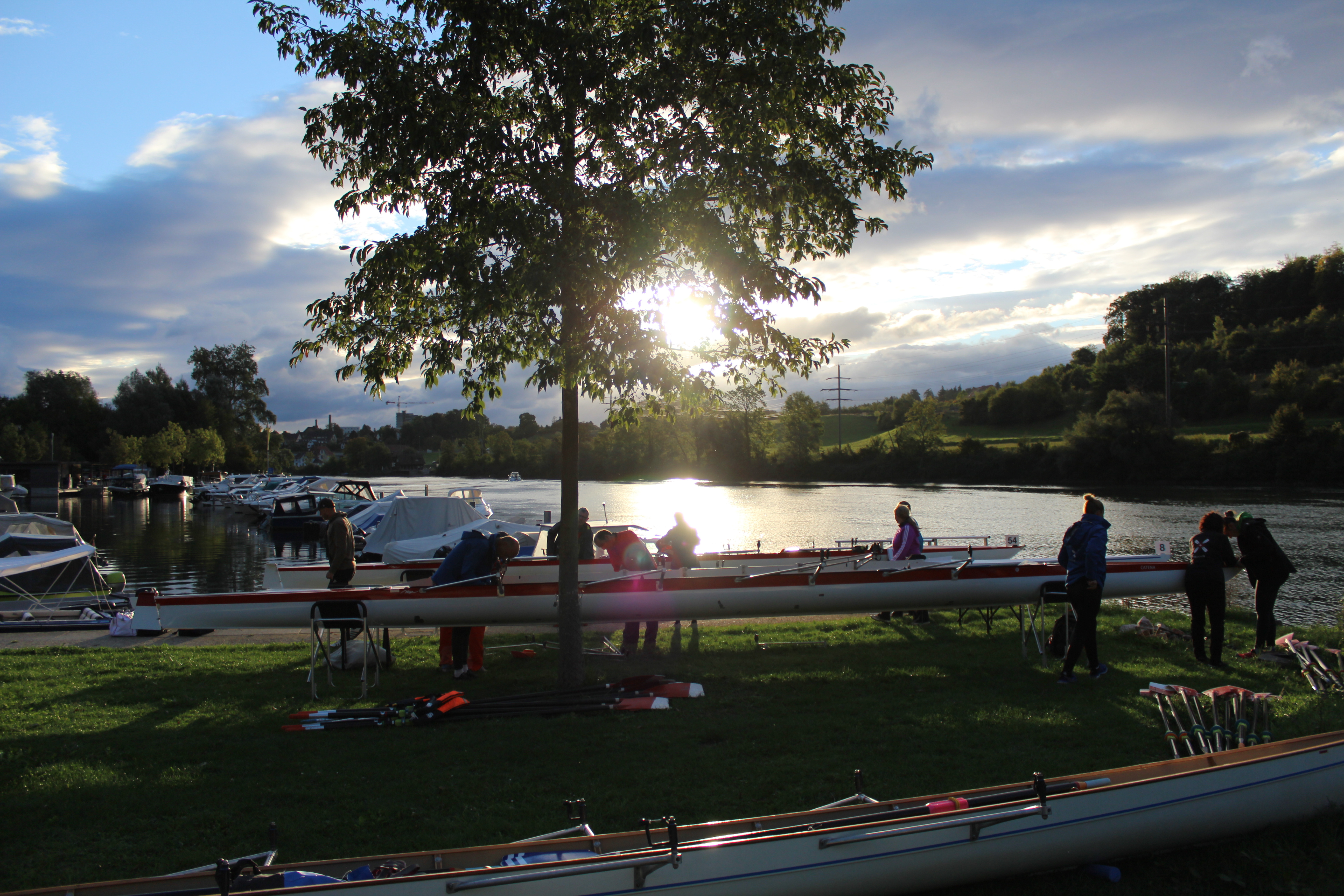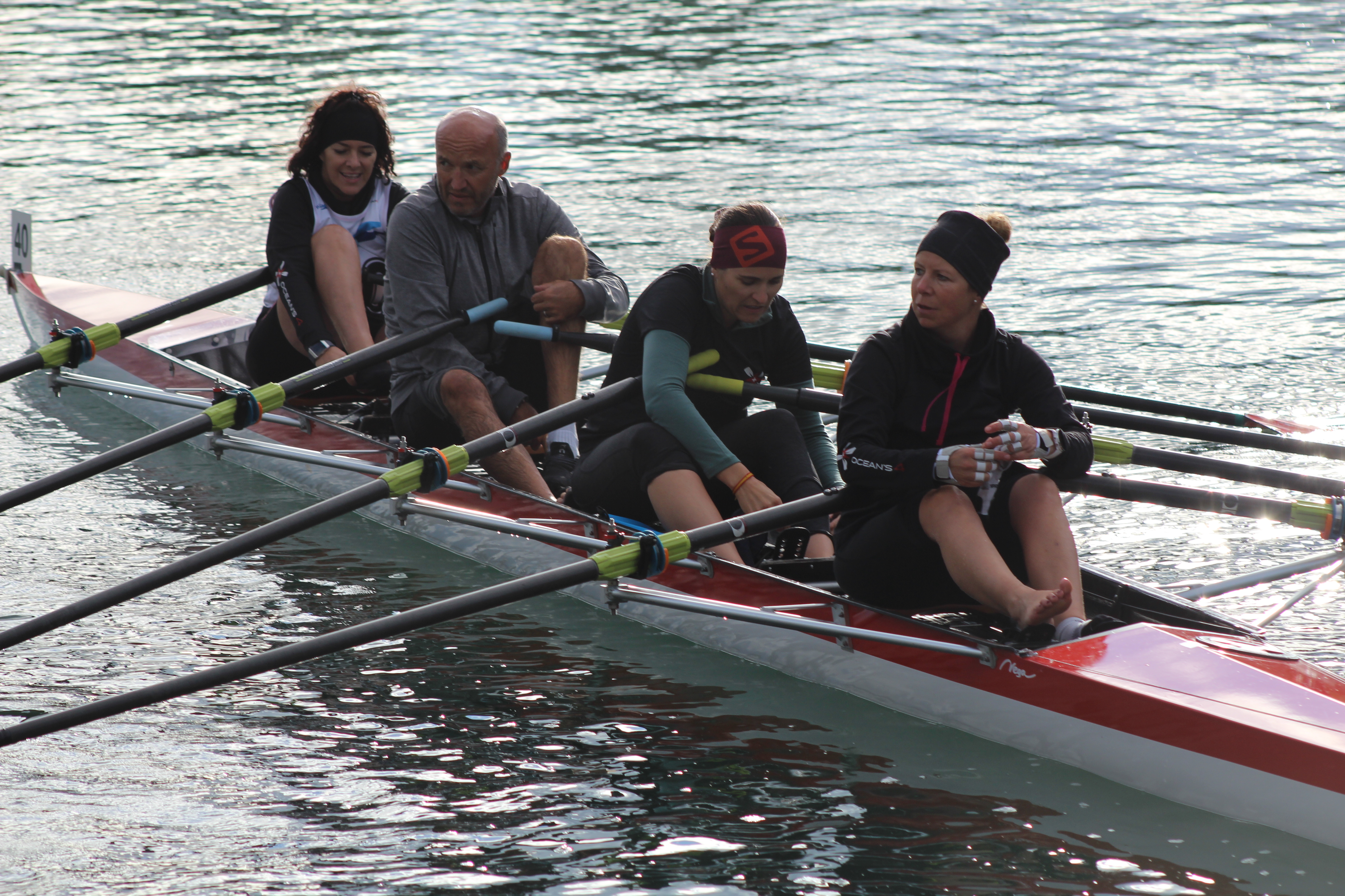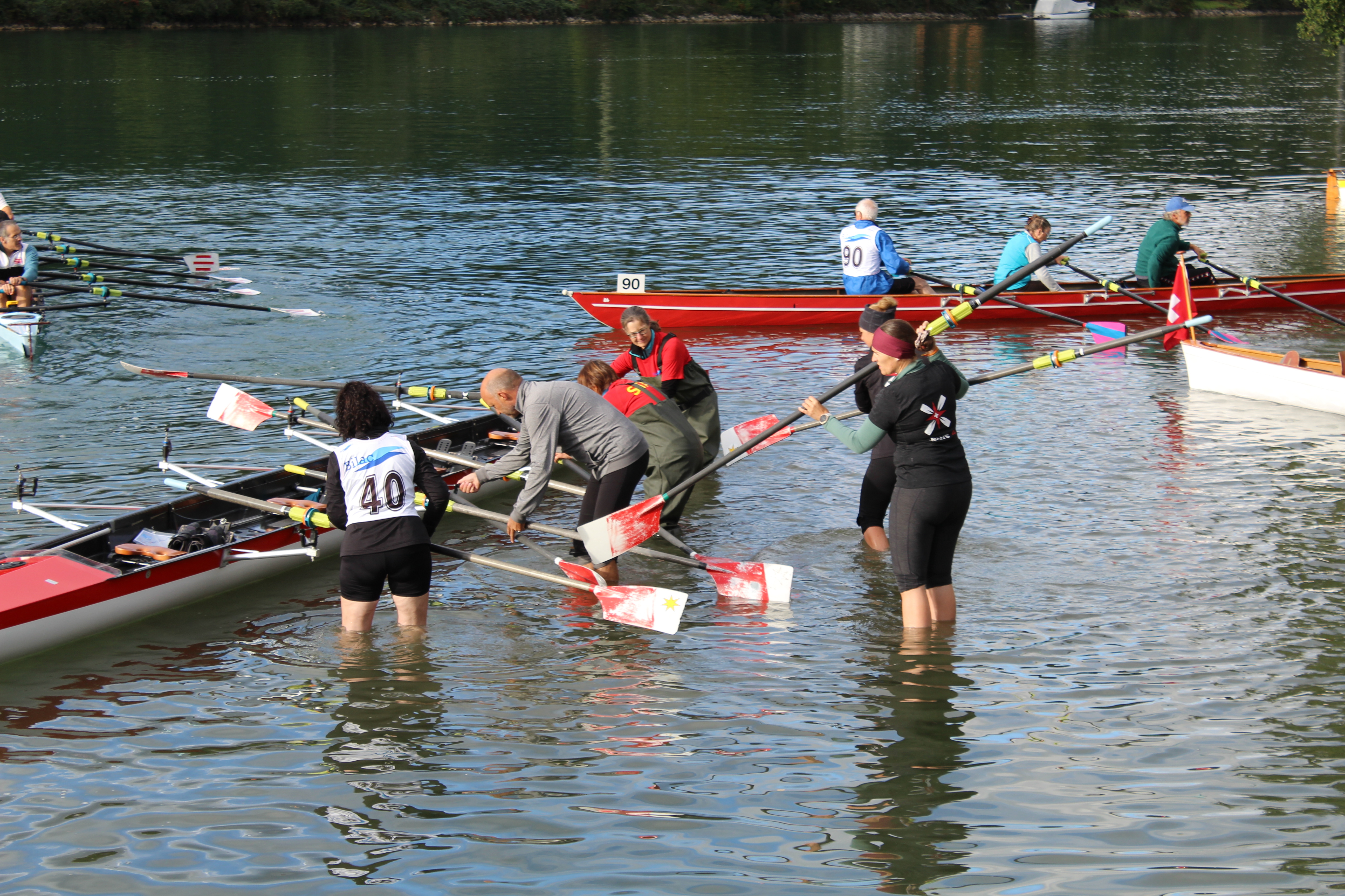 Doch bis zum Start hatten Astrid, Denise, Thesi und Philipp noch einige Vorbereitungen zu treffen. Zunächst musste das durch den Seeclub Thun transportierte Ruderboot abgeladen, zum Wasser getragen und aufgeriggert werden. Die Einwasserung der Ruderboote beim grossen Andrang von 92 Teams war anspruchsvoll und zum Glück standen von Seiten Veranstalter viele Helfer im Einsatz. Die Stimmung im Team war von heiter bis freudig angespannt, waren die OCEAN'S 4 bis zu diesem Zeitpunkt noch nie als Team in einem klassischen Ruderboot unterwegs. Und die Streckenlänge von 36km war für Thesi mit Abstand die Längste, die sie bisher zu absolvieren hatte.